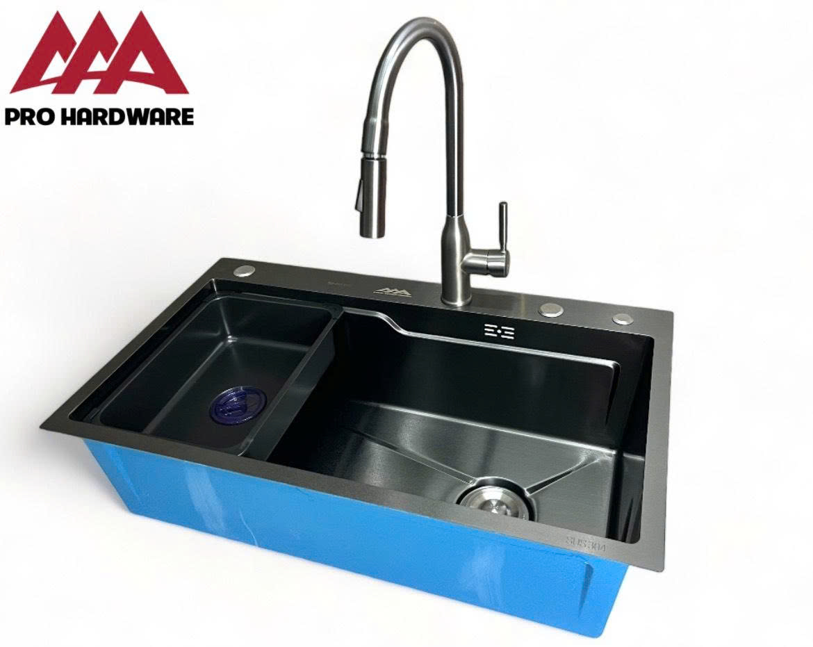 Bồn rửa chén màu đen inox 304 được thiết kế theo phong cách hiện đại, tối giản nhưng vẫn toát lên vẻ sang trọng và tinh tế. Gam màu đen giúp không gian bếp trở nên nổi bật, dễ phối hợp với nhiều phong cách tủ bếp khác nhau.