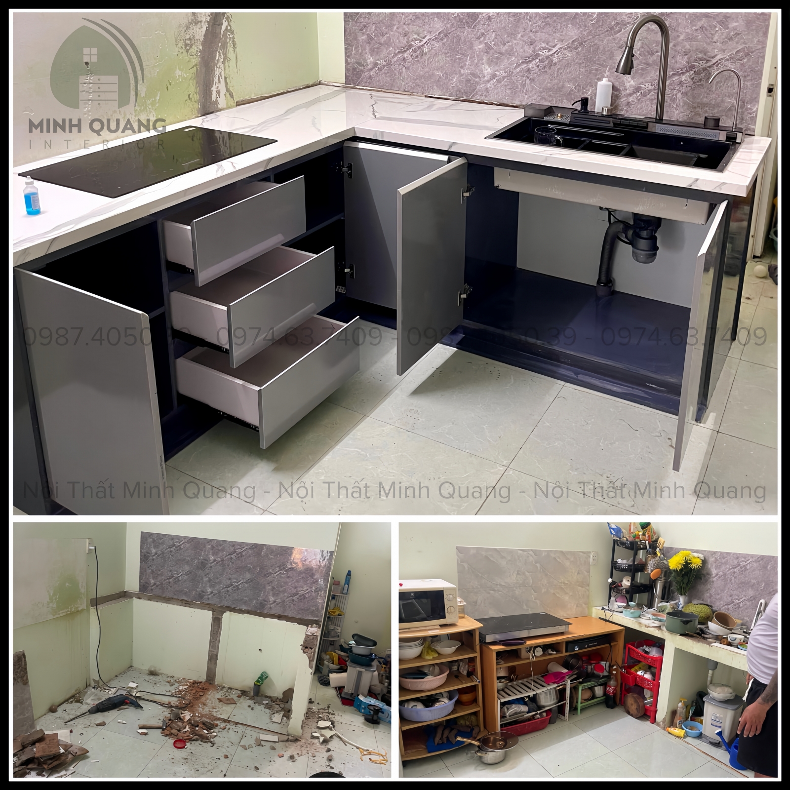 ✔️ Nâng cấp mặt đá, ốp kính bếp, thay bồn rửa, vòi nước, bếp nấu...
