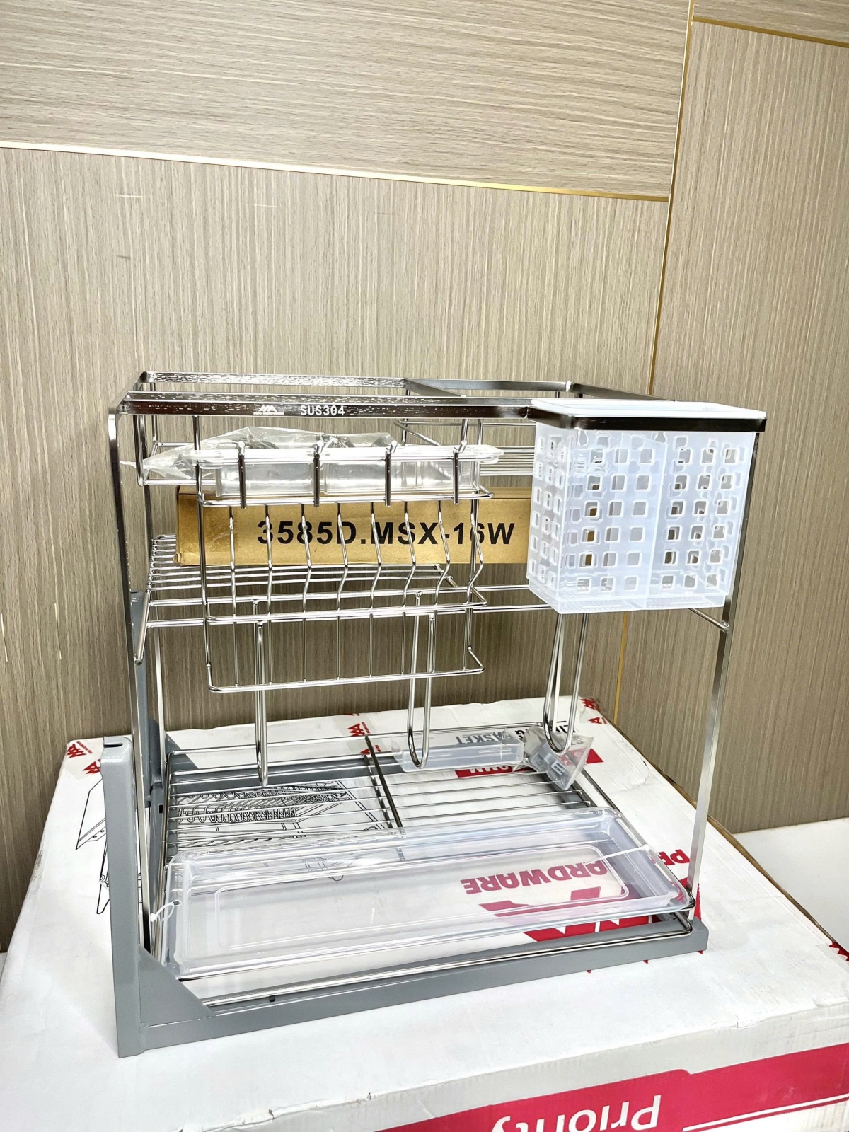 Thiết kế các ngăn chứa dao, thớt riêng biệt giúp cố định vật dụng chắc chắn, hạn chế rơi rớt gây nguy hiểm. Khay hứng nước bên dưới giúp giữ lại nước sau khi rửa dao thớt, giữ khu vực bếp luôn khô ráo, sạch sẽ và an toàn.