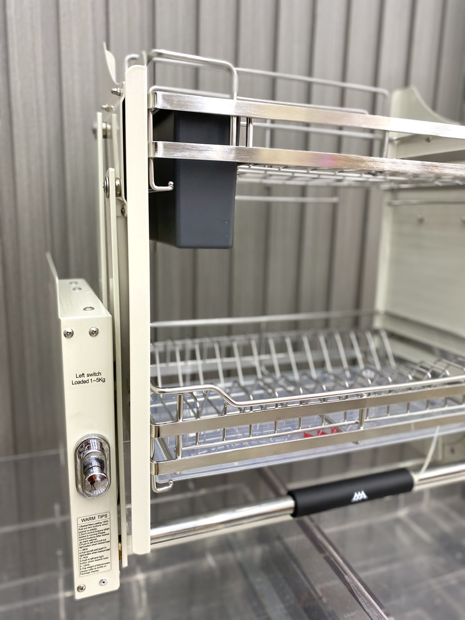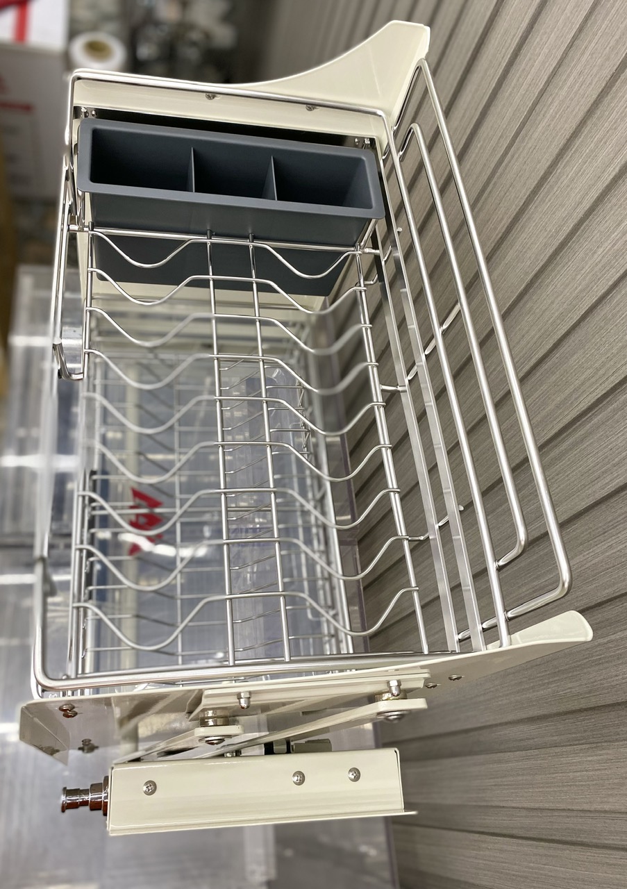 Kệ nâng hạ có khay đũa inox 304 được thiết kế chuyên dụng cho tủ bếp trên, cho phép người dùng kéo hạ kệ xuống tầm tay khi sử dụng và nâng lên gọn gàng sau khi cất đồ.