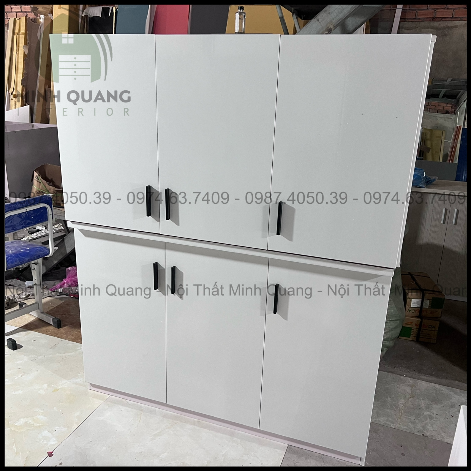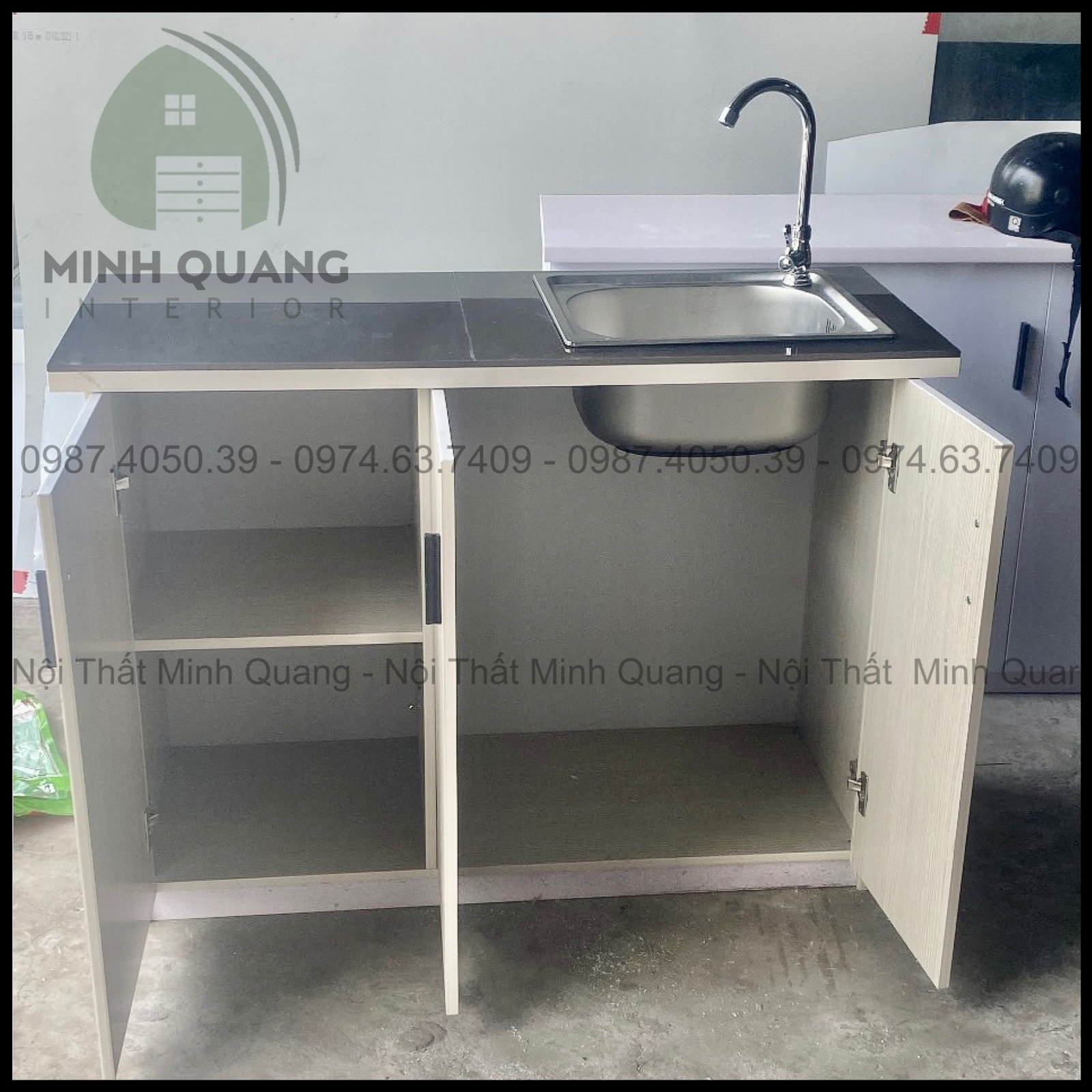 Tủ được thiết kế thông minh gồm tủ trên – tủ dưới, có sẵn bồn rửa, khoang để bếp, kệ úp chén và không gian chứa đồ hợp lý. Các mẫu phổ biến như tủ bếp mini 1m2, 1m4, 1m6 hoặc dạng góc chữ L giúp phù hợp với nhiều căn hộ có diện tích nhỏ.