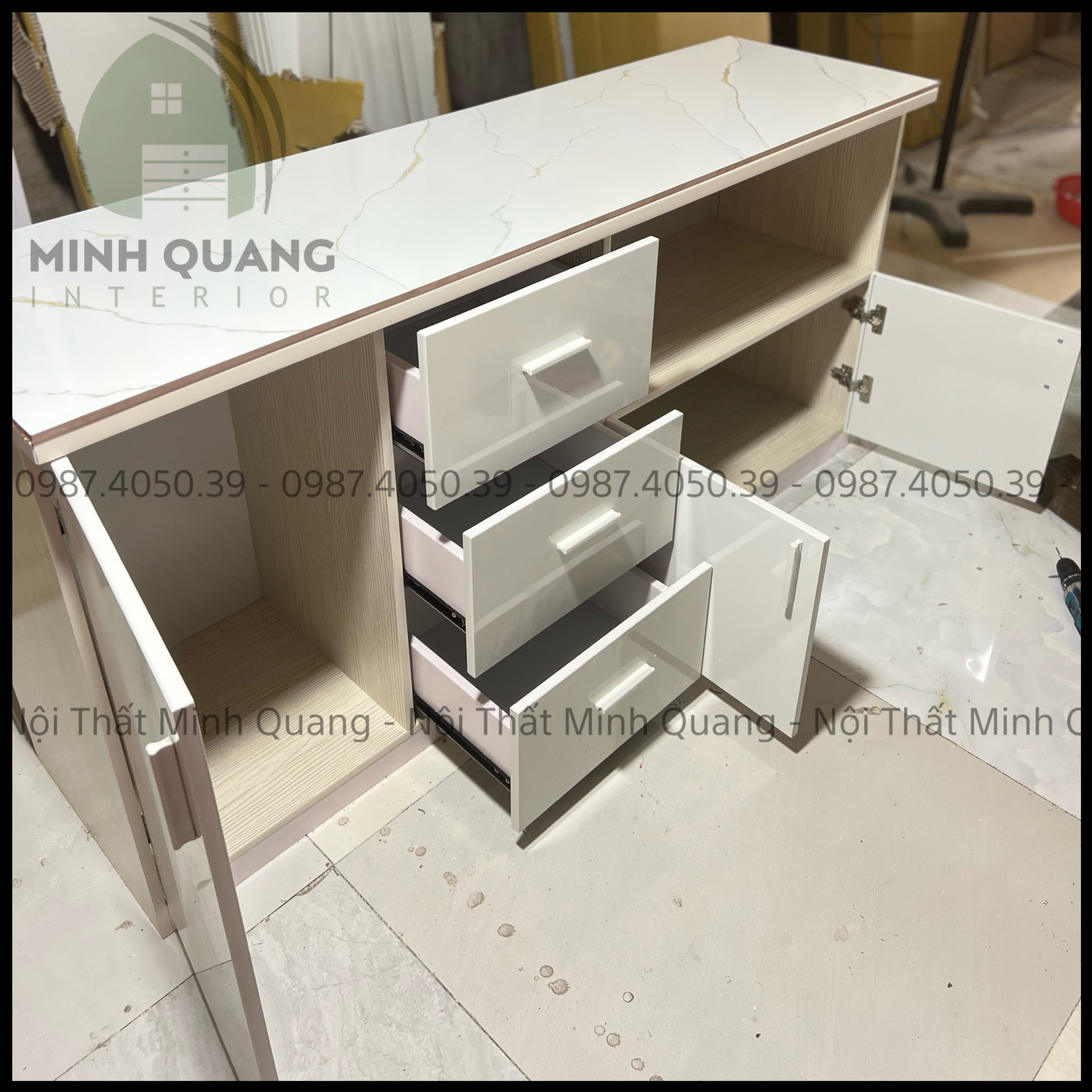 Tủ được thiết kế thông minh gồm tủ trên – tủ dưới, có sẵn bồn rửa, khoang để bếp, kệ úp chén và không gian chứa đồ hợp lý. Các mẫu phổ biến như tủ bếp mini 1m2, 1m4, 1m6 hoặc dạng góc chữ L giúp phù hợp với nhiều căn hộ có diện tích nhỏ.