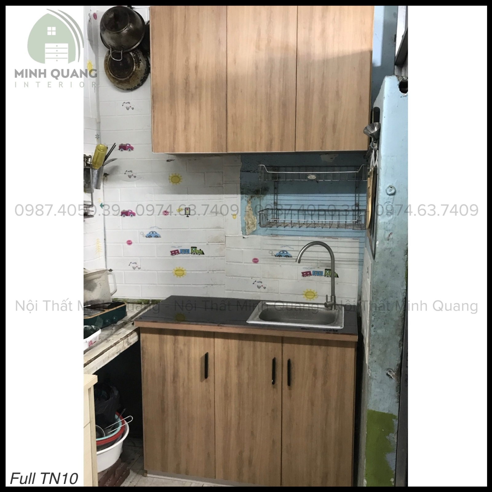Tủ được thiết kế thông minh gồm tủ trên – tủ dưới, có sẵn bồn rửa, khoang để bếp, kệ úp chén và không gian chứa đồ hợp lý. Các mẫu phổ biến như tủ bếp mini 1m2, 1m4, 1m6 hoặc dạng góc chữ L giúp phù hợp với nhiều căn hộ có diện tích nhỏ.