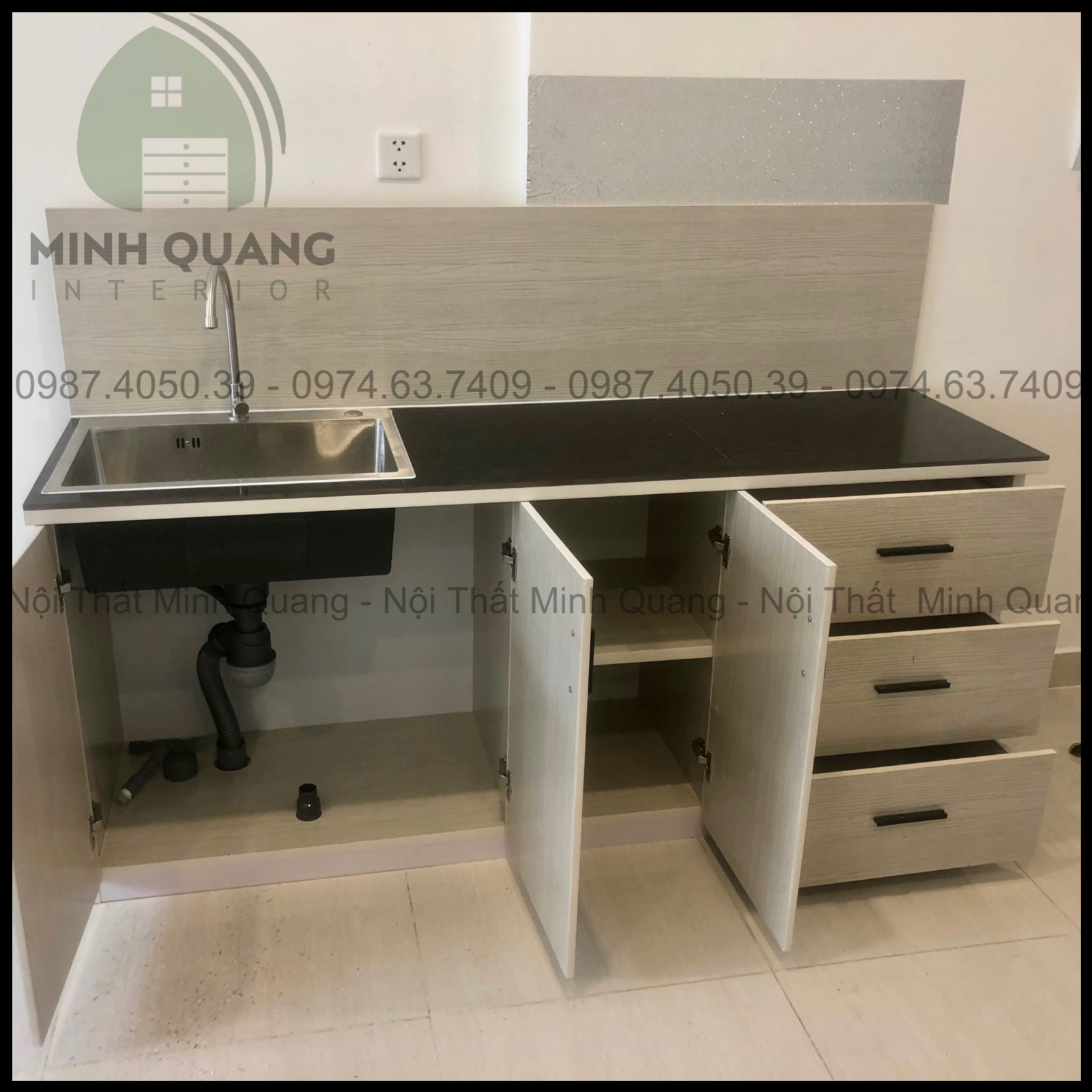 Tủ được thiết kế thông minh gồm tủ trên – tủ dưới, có sẵn bồn rửa, khoang để bếp, kệ úp chén và không gian chứa đồ hợp lý. Các mẫu phổ biến như tủ bếp mini 1m2, 1m4, 1m6 hoặc dạng góc chữ L giúp phù hợp với nhiều căn hộ có diện tích nhỏ.
