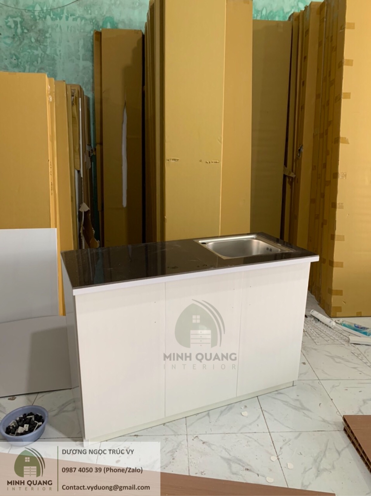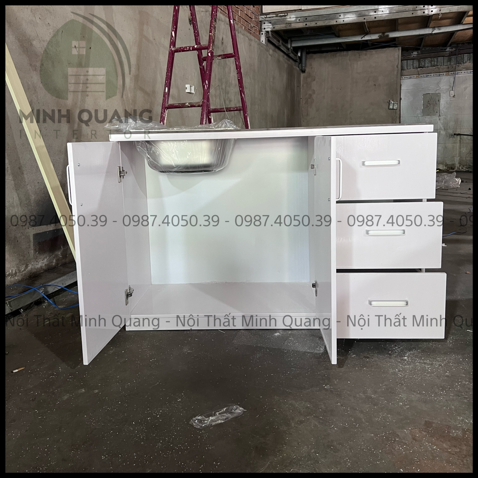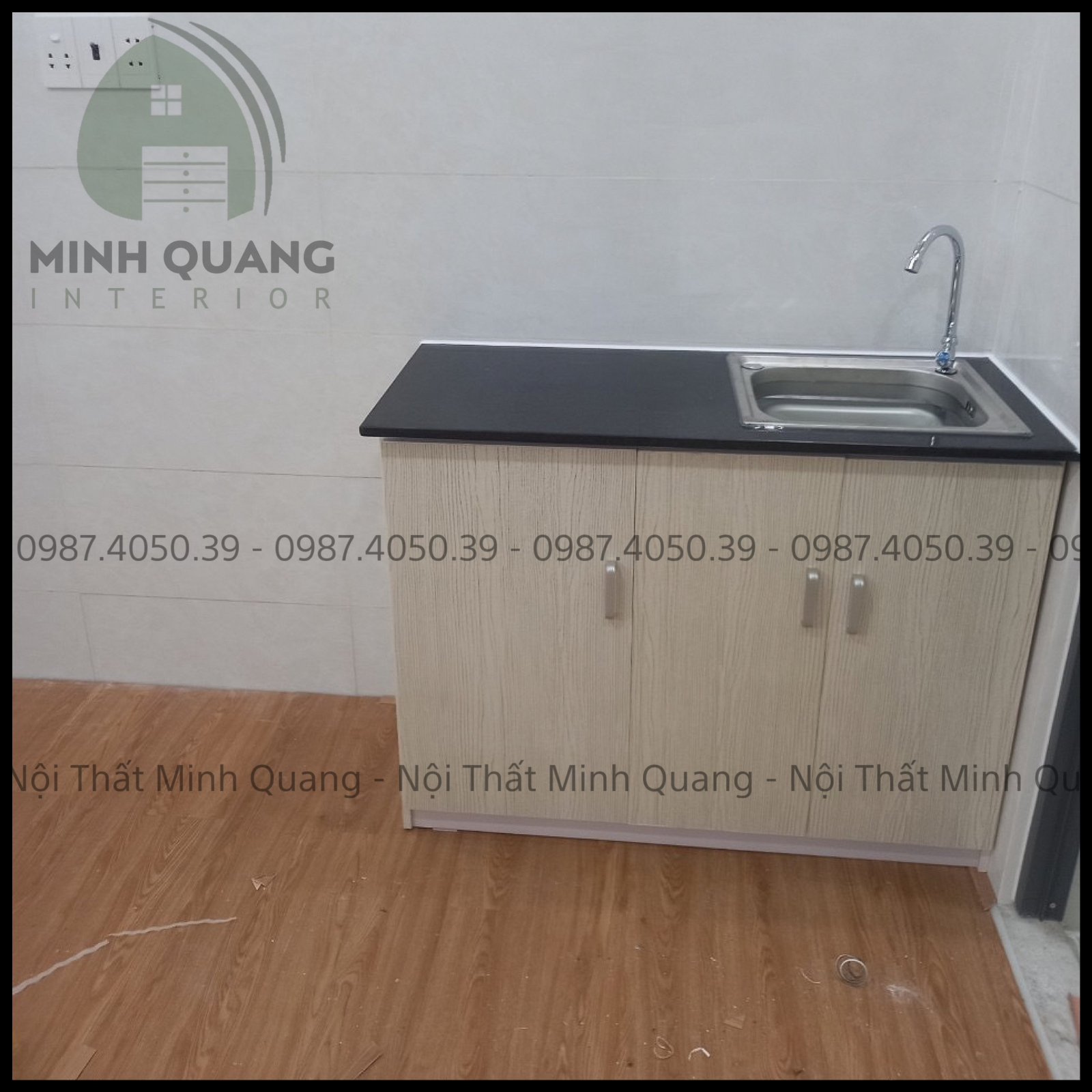 Tủ được thiết kế thông minh gồm tủ trên – tủ dưới, có sẵn bồn rửa, khoang để bếp, kệ úp chén và không gian chứa đồ hợp lý. Các mẫu phổ biến như tủ bếp mini 1m2, 1m4, 1m6 hoặc dạng góc chữ L giúp phù hợp với nhiều căn hộ có diện tích nhỏ.