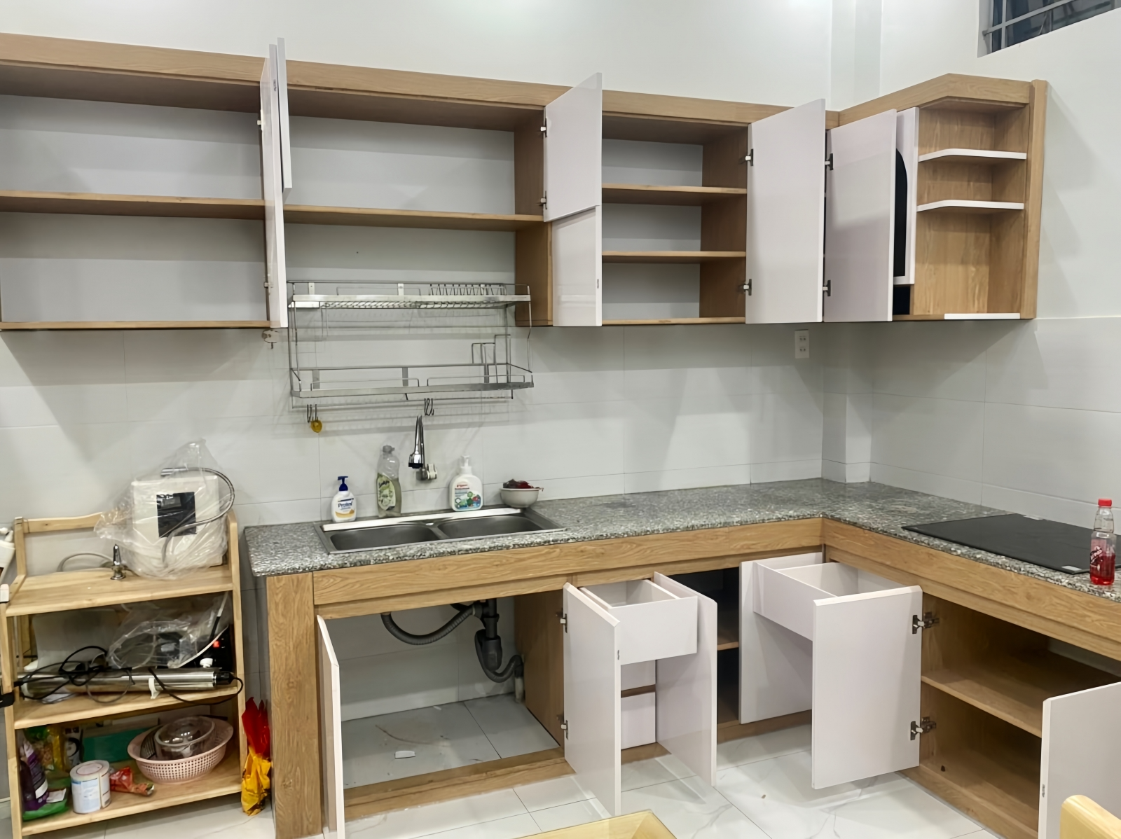 Tủ bếp có thể lắp thêm nhiều phụ kiện tiện ích như ray trượt, bản lề giảm chấn, kệ xoay góc, khay để gia vị, giá úp chén inox 304, mâm xoay, tủ kho… Những phụ kiện này giúp bạn sắp xếp đồ đạc gọn gàng hơn, thao tác nấu nướng cũng dễ dàng và tiện lợi hơn mỗi ngày.