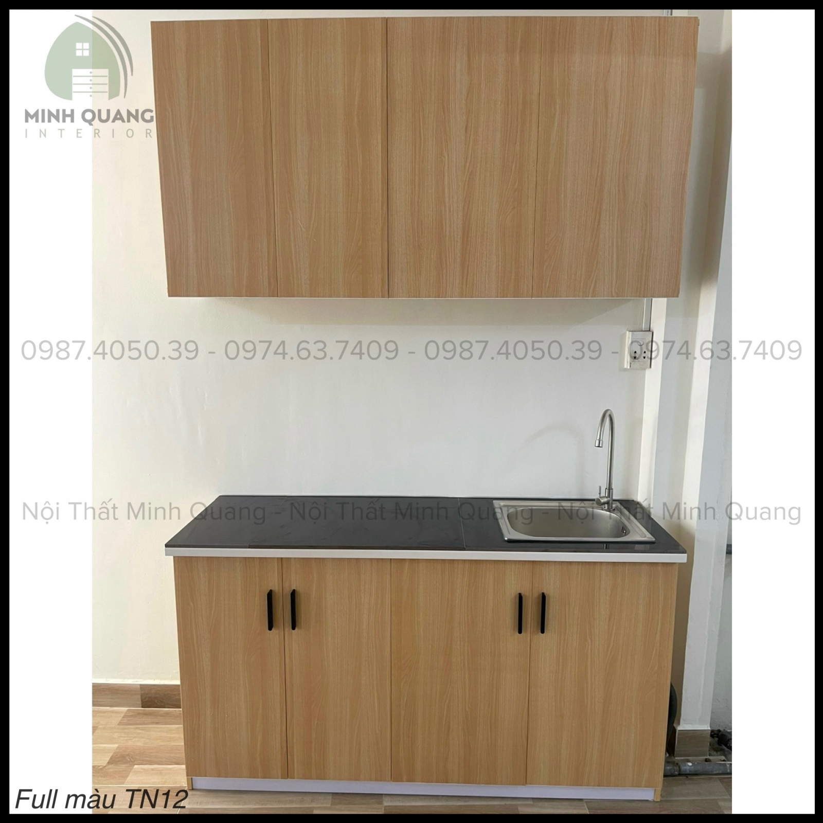Tủ được thiết kế thông minh gồm tủ trên – tủ dưới, có sẵn bồn rửa, khoang để bếp, kệ úp chén và không gian chứa đồ hợp lý. Các mẫu phổ biến như tủ bếp mini 1m2, 1m4, 1m6 hoặc dạng góc chữ L giúp phù hợp với nhiều căn hộ có diện tích nhỏ.