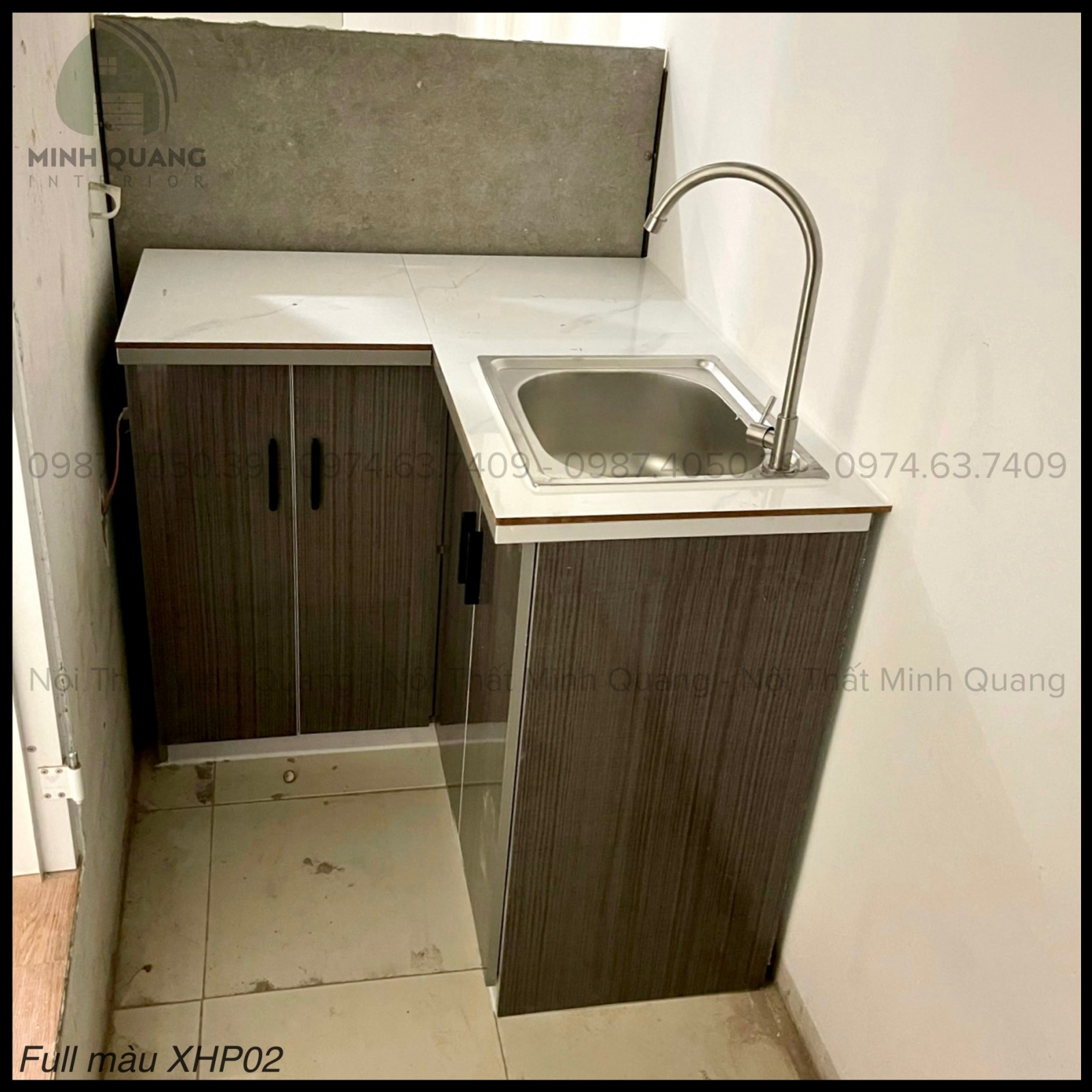 Tủ được thiết kế thông minh gồm tủ trên – tủ dưới, có sẵn bồn rửa, khoang để bếp, kệ úp chén và không gian chứa đồ hợp lý. Các mẫu phổ biến như tủ bếp mini 1m2, 1m4, 1m6 hoặc dạng góc chữ L giúp phù hợp với nhiều căn hộ có diện tích nhỏ.