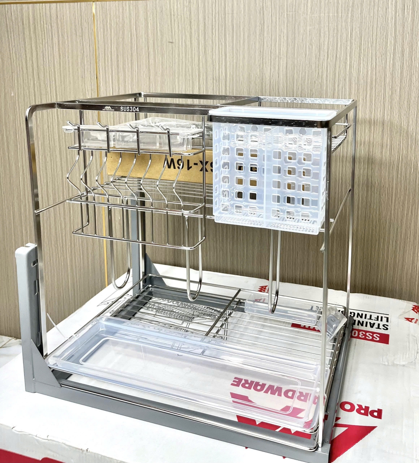 Thiết kế các ngăn chứa dao, thớt riêng biệt giúp cố định vật dụng chắc chắn, hạn chế rơi rớt gây nguy hiểm. Khay hứng nước bên dưới giúp giữ lại nước sau khi rửa dao thớt, giữ khu vực bếp luôn khô ráo, sạch sẽ và an toàn.