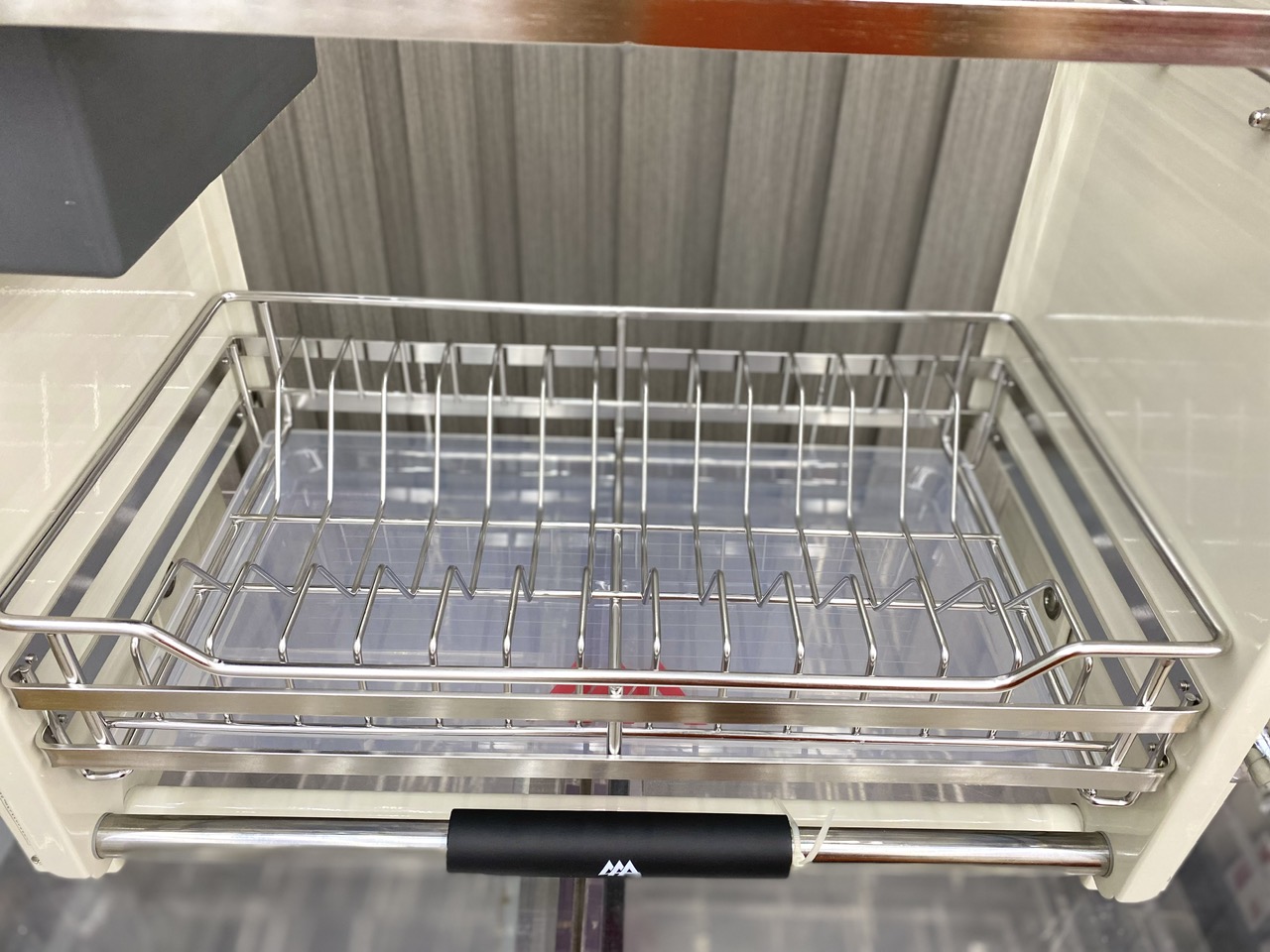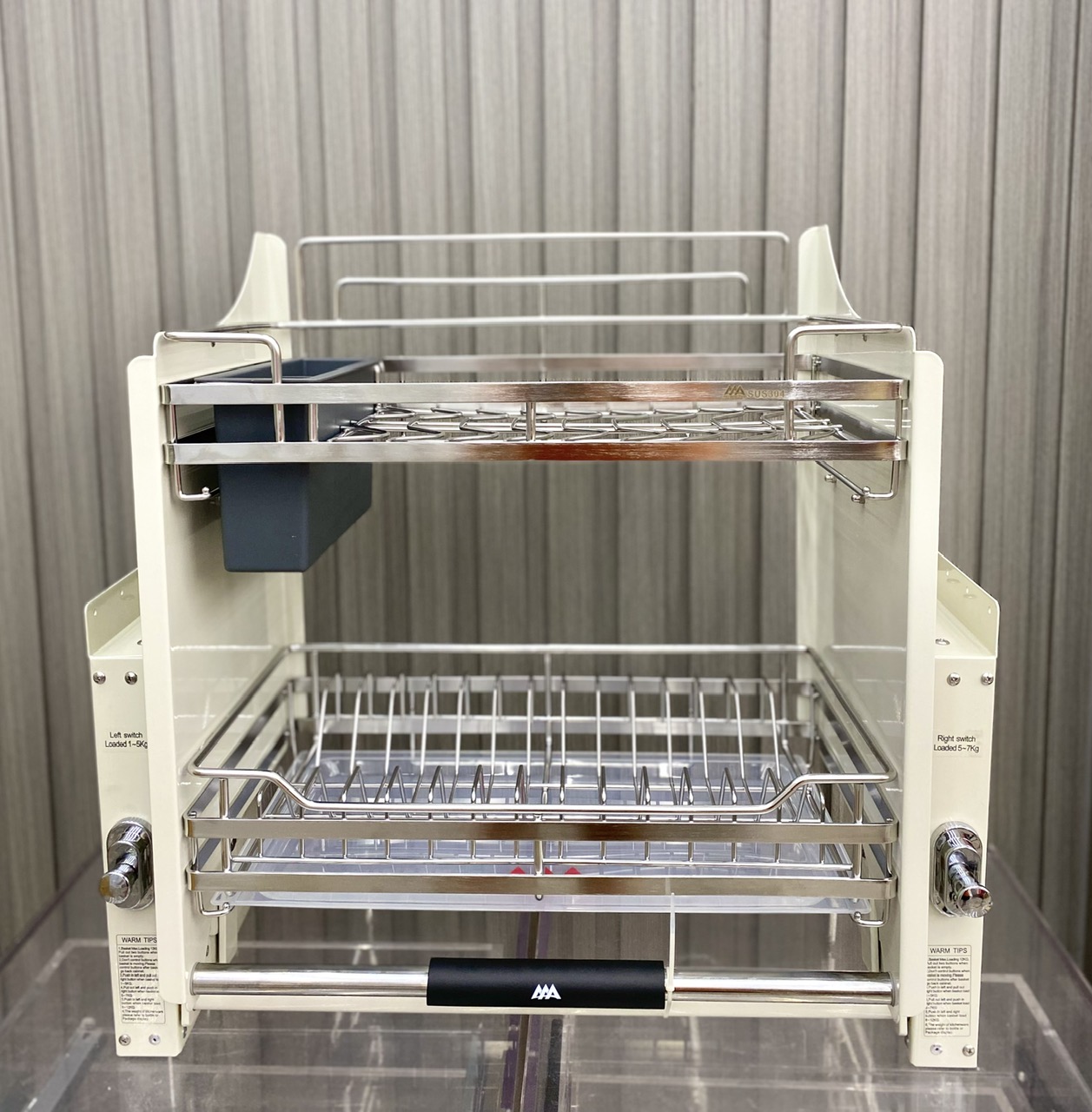 Kệ nâng hạ có khay đũa inox 304 được thiết kế chuyên dụng cho tủ bếp trên, cho phép người dùng kéo hạ kệ xuống tầm tay khi sử dụng và nâng lên gọn gàng sau khi cất đồ.